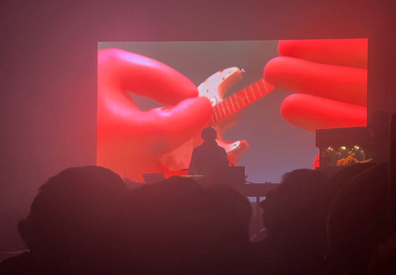 But OPN exploited the diorama concept to disorienting, fascinating effect. At times the entire room went dark except for the foggy puppet stage, glowing a menacing red. During “Krumville”, Mini Dan was set aside so Tet could put on a thick red pair of rubber gloves and pick up a detailed miniature Fender Telecaster. The song’s somber guitar breakdown, evoking Midwest emo or the calm before a Deftones storm, wasn’t recorded with a guitar. The dreary plucks are a signature bit of uncanny Lopatin sound design, earnestly tugging teenage heartstrings while wobbling with the too-clean precision of a physical modeling synth. It was thrilling to see that tension, a key node of the OPN project, out in the open: Tet’s Pixar-ed hands aped a picking posture, pantomiming playing guitar to a guitar track that sounded a whole lot like guitar but was definitively not.